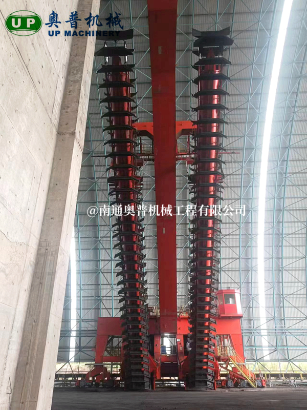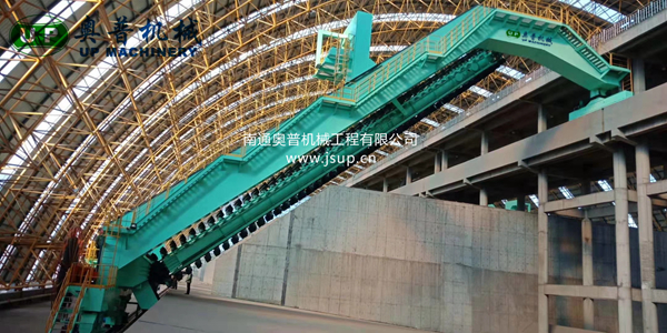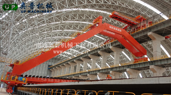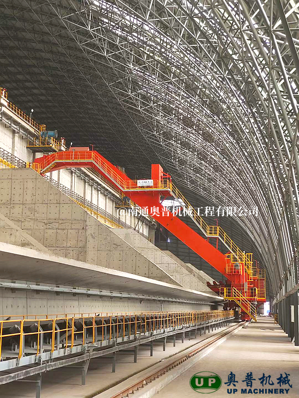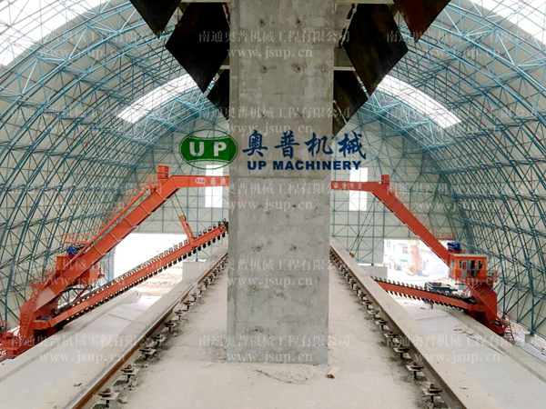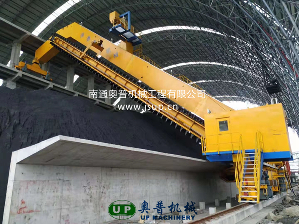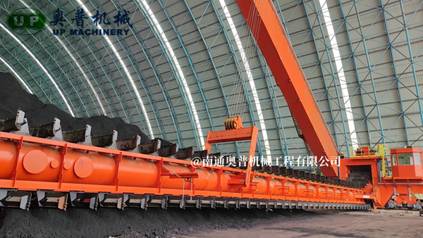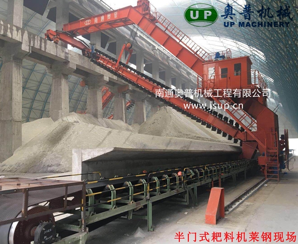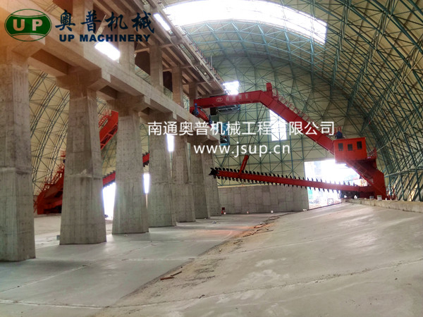 ▲南通奧普機(jī)械創(chuàng)新研制的“雙刮板、雙卷揚(yáng)、翹尾式”半門式刮板取料機(jī)