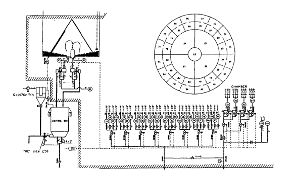 CP生料均化庫是我公司引進(jìn)的德國BMH公司的一種新型生料均化庫,其特點(diǎn)電耗低、均化效果好。CP生料均化庫的均化原理是庫頂生料通過8條斜槽均勻布料,不同時(shí)期的生料在庫內(nèi)呈橫向分布,庫底充氣系統(tǒng)設(shè)計(jì)更符合生料充氣后的流動(dòng)性,呈放射狀斜向分布,環(huán)形區(qū)一般分8個(gè)區(qū),每隔5分鐘輪流充氣,充氣區(qū)生料因松動(dòng)及氣流的引導(dǎo)卸入中心區(qū),庫內(nèi)不同層的生料豎向切割下料實(shí)現(xiàn)生料的均化,不同時(shí)間的生料進(jìn)入中心區(qū)后再進(jìn)行氣體強(qiáng)烈混合均化,從而達(dá)到理想的均化效果。