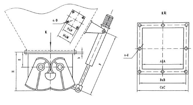 腭式閘門由本體、扇形閘板、軸、齒輪、密封件、執(zhí)行機(jī)構(gòu)等部件構(gòu)成。手動(dòng)或執(zhí)行機(jī)構(gòu)推動(dòng)搖桿,使齒輪帶動(dòng)扇形閘板沿軸心旋轉(zhuǎn),使兩個(gè)扇形閘板向兩邊開啟,物料隨即下落,待接料裝置滿載后,再由執(zhí)行機(jī)構(gòu)帶動(dòng)搖桿,使扇形閘板復(fù)位,關(guān)閉截?cái)嘞侣涞奈锪稀?br />EF-C外形圖: